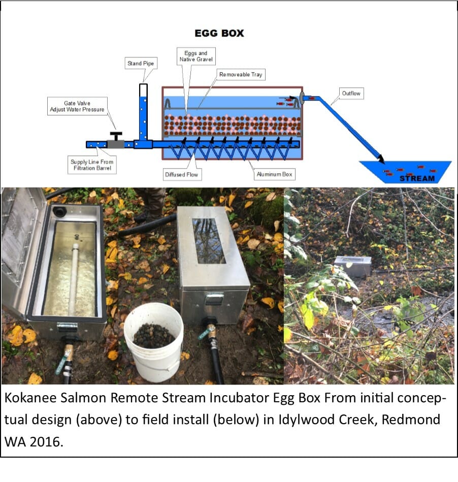 In 2016, I received funding support for the design and implementation of an RSI system from Campbell Global and Wally Pereyra (kokanee super fan). TU and King County worked together to develop and install two RSIs, which were designed to be installed in remote locations and provide a “safe space” for kokanee salmon eggs to rear, hatch, emigrate to the stream or lake, and rapidly recolonize the natal stream. Unfortunately, in 2016 The Lake Sammamish kokanee spawning returns were low (88 fish) and none were collected for the supplementation program. Consequently, we decided to test our system to failure to find the bugs and fix them before the next season.