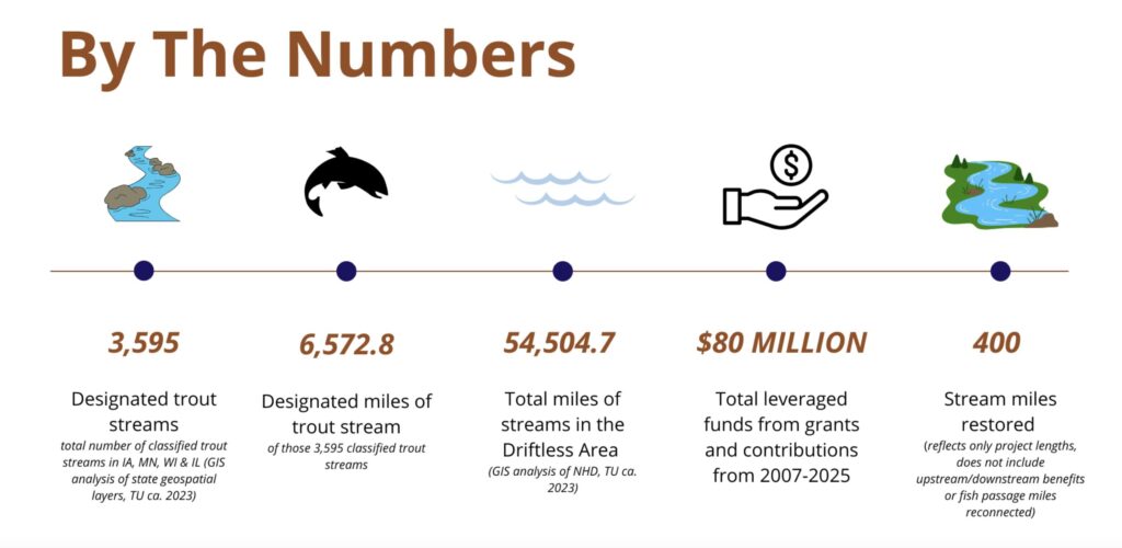 The Driftless Area Restoration Effort (TU DARE) is a long-running collaborative initiative focused on restoring coldwater streams, improving fish habitat, and strengthening watershed health across the Upper Midwest.