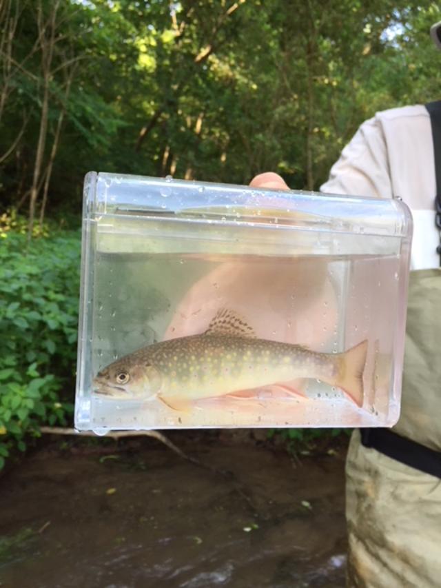 Wild brook trout from a nearby tributary to the Delaware River were transplanted into the stream in the spring of 2017. Recent sampling has found both adult (below) and young of the year trout — evidence that the fish are reproducing.