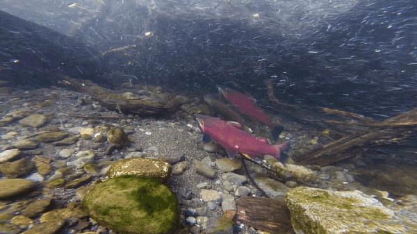 Adult coho salmon rest behind a submgerged tree. Katrina Liebich/USFWS