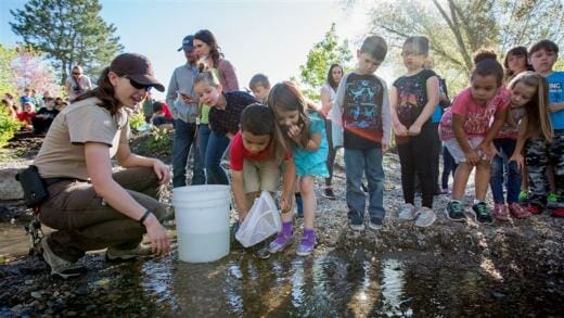 Students from a kindergarten class in northern Utah release fish they raised as part of the Trout in the Classroom program. Trout Unlimited photo.