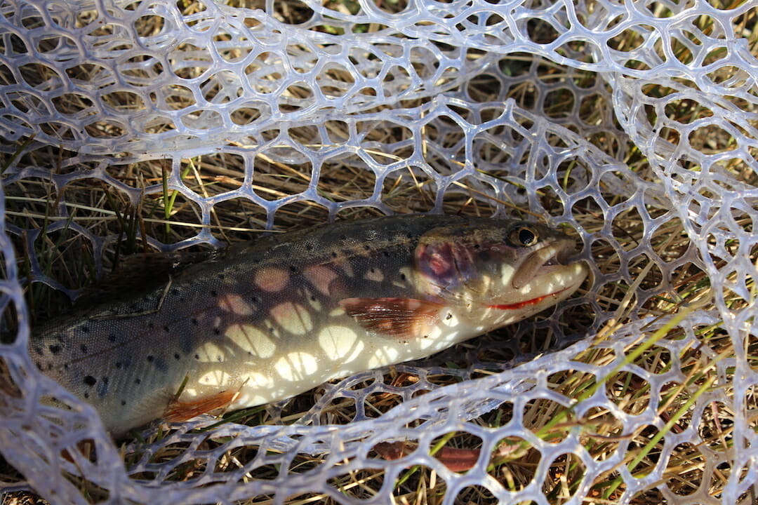 We sat down and looked at the fish in the net. I explained the difference between a char and a trout and asked him if this fish had the cutthroat mark on his throat. When pressed, he finally admitted that the tiger trout did not have the red slashes he was looking for and was willing to give it another try. He again flopped the indicator and less than a minute later the indicator went down again.
